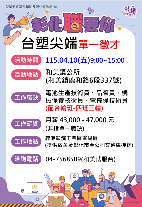 其他活動 0410台塑尖端徵才活動 📍和美鎮公所 發布日期 2026/03/30~2026/04/10 | 發佈單位: 勞工處就業服務科 | 發佈日期: 王靜儀 7568509 | 更新日期 2026/03/30 | 瀏覽人數: 4人 🔆廠商名稱:台塑尖端能源科技股份有限公司 🕤活動時間:115年4月10日 星期五 9:00 ~ 15:00 🔅活動地點:和美鎮公所 【和美鎮鹿和路6段337號】 *️⃣職業名稱:電池生產技術員、品管員、機械保養技術員、電儀保技術員、生產技術技術員 (配合輪值-四班三輪) 💰薪 資:43,000-47,000元(非指單一職缺) 💰 💎公司簡介:台塑新智能2023年透過子公司「台灣尖端能源」在彰濱工業區投資上百億元,建造全台灣規模最大的5GWh鋰鐵電芯及模組廠,為電動車及儲能系統提供安全、穩定的鋰鐵電芯,打造完整的國產電池產業鏈,開啟台灣新能源產業的新紀元。 💥福利制度: 年資每滿五年贈1枚24K紀念金幣、每年固定調薪制度、高於業界水準的年終及三節獎金、員工及眷屬至長庚醫院就醫補助、免費健檢、保健諮詢服務、電動機車換購補助1.6萬元、新購補助1萬元、生日禮物券、三節福利券、春秋兩季員工郊遊、踏青補助、歲末年終歡樂聚餐、0到6歲每月2千元育兒補助、懷孕福袋、寶寶禮品及禮金、子女教育獎學金 ▶️工作內容:電池製造業 ▶️交通能力:1.自行前往2.提供宿舍3.彰化市至公司交通車接送 ▶️工作地點:鹿港彰濱工業區崙尾區 ▶️工作時間:日班、輪班(四班三輪) ☎️洽詢電話:04-7568509 (和美就服台)