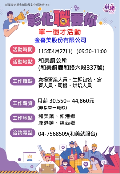 其他活動 🎈🎈🎈金喜美股份有限公司(喜美超市)單一徵才活動~和美鎮公所 發布日期 2026/04/08~2026/05/08 | 發佈單位: 勞工處就業服務科 | 發佈日期: 王靜儀 7568509 | 更新日期 2026/04/08 | 瀏覽人數: 11人 🔆廠商名稱:金喜美股份有限公司 🕤活動時間:115年4月27日 星期一 9:30 ~ 11:00 🔅活動地點:和美鎮公所 【和美鎮鹿和路6段337號】 *️⃣職業名稱:賣場營業人員、生鮮包裝、倉管人員、司機、烘培人員 💰薪 資:月薪30,550-44,860元(非指單一職缺) 💰 💎公司簡介: 金喜美股份有限公司-喜美超市有36家直營超級市場,成立於民國81年12月25日,鹿港民權店開幕後-即陸續展店,至今有36家門市及實力堅強的管理總部。 喜美超市主要滿足彰化縣市(鹿港.福興.埔鹽.大村.花壇.和美.線西.伸港.彰化市)、台中市(大肚.龍井.梧棲.清水.南屯.西屯.北屯.大雅.潭子.神岡.豐原.后里.外埔)鄉親居民的民生必需品之需求,提供更新鮮、舒適の購物環境。 💥福利制度:年終獎金、績效獎金、聚餐、員工旅遊、春酒、婚喪喜慶補助金、員工健康檢查、完整教育訓練及升遷管道。 ▶️工作地點:和美鎮、伸港鄉、鹿港鎮、線西鄉 ☎️洽詢電話:04-7568509 (和美就服台)