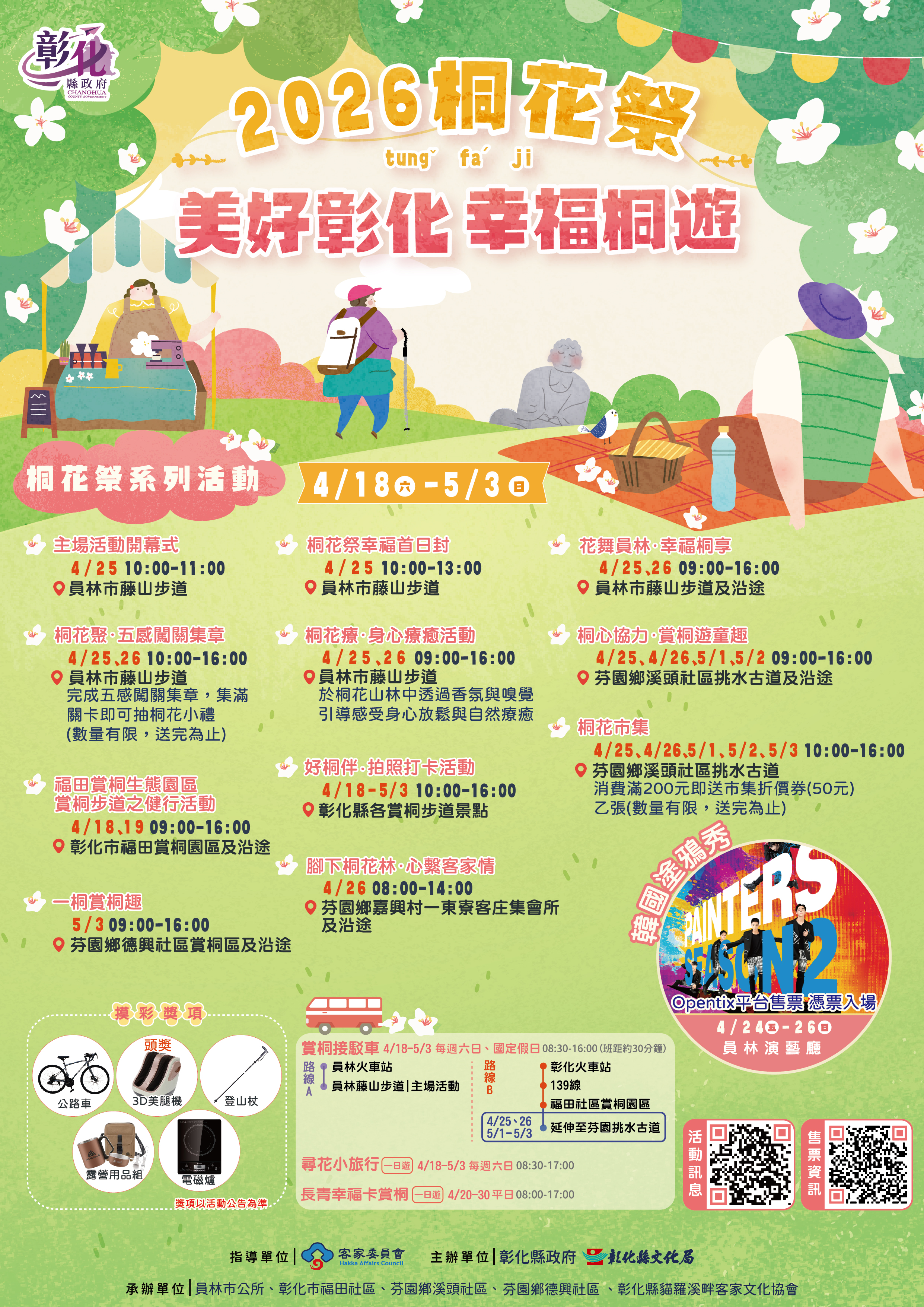 年度活動 2026桐花祭~美好彰化 幸福桐遊 發布日期 2026/04/10~2026/05/03 | 發佈單位: 文化局藝文推廣課 | 發佈日期: 藝文推廣科 郭小姐 04-7250057#1859 | 更新日期 2026/04/10 | 瀏覽人數: 27人 《置頂》 🌸 2026桐花祭~美好彰化 幸福桐遊 📅 4/18(六) ~ 5/3(日) 現在正是最佳賞花時節,邀您一起 #幸福桐遊 ✨員林主場 特色亮點 ♦️桐花療|身心療癒體驗(芳療引導 × 呼吸練習) 在桐花林中放鬆身心,感受自然療癒力量 👉線上報名:https://reurl.cc/Z2XdaQ ♦️桐花聚|五感闖關集章,認識桐花與客家文化 ♦️桐花秀|韓國塗鴉秀 PAINTERS(4/24-26 員林演藝廳) ♦️桐遊小旅行|跟著走更好玩! 尋花小旅行一日遊 4/18-5/3 每週六日及國定假日, 串聯桐花景點、古蹟、客庄, 跟著導覽深入體驗,每人只要 $300 🌸 ✨賞桐景點|五處串聯 📍彰化福田賞桐生態園區 (4/18、4/19) 親子健行、生態漫遊 步道友善好走,大人小孩都適合 📍員林藤山步道 (4/25、4/26) 開幕式 × 健行活動 × 市集 × 療癒體驗,一次玩透透 🎉 📍芬園一東寮客庄 (4/26) 健走巡禮 × 客庄文化體驗 結合客語解說,深入認識客家生活與文化 📍芬園挑水古道 (4/25、4/26、5/1、5/2) 健行賞桐、古道漫遊、生態導覽、DIY體驗 同樣地點還有 #桐花市集(4/25、4/26、5/1、5/2、5/3) 邊走邊玩、邊逛市集好愜意! 📍芬園德興社區 (5/3) 賞桐步道健行 × 客語導覽 農夫市集 × 手作體驗,感受在地風情 🎉不只賞花,還有這些! 📮桐花幸福首日封臨時郵局(4/25) 📸拍照打卡抽好禮(4/18-5/3) 🛍️桐花市集消費滿200元送50元折價券(數量有限) 🍪填寫問卷還可兌換桐花小餅乾(數量有限) 🚌賞桐接駁服務 4/18-5/3 週六日及國定假日 員林/彰化火車站皆有發車 一日周遊券只要 $50 🙌 ⚠️ 小提醒 ✔️ 花況以現場為準 ✔️ 建議穿舒適運動鞋 ✔️ 請勿採摘,守護山林美景 🌿 🗺️ 更多資訊:https://www.bocach.gov.tw/chtung/