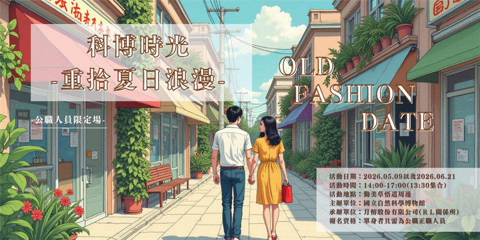 健康休閒 【未婚聯誼】轉知國立自然科學博物館115年「科博時光:重拾夏日浪漫」單身聯誼活動 發布日期 2026/04/16~2026/05/16 | 發佈單位: 人事處 | 發佈日期: 陳思錡 7531444分機1444 | 更新日期 2026/04/16 | 瀏覽人數: 9人 轉知國立自然科學博物館115年「科博時光:重拾夏日浪漫」單身聯誼活動,相關資訊如附件。