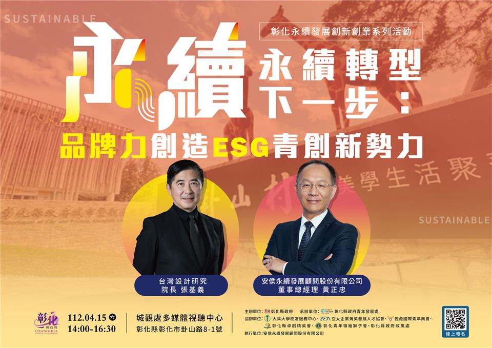 活動快訊 【永續發展創新創業】-永續轉型下一步!品牌力創造ESG青創新勢力 課程即將於4月15日精彩揭幕,歡迎大家踴躍報名 歷史訊息 | 發布日期 2023/03/21~2023/04/15 | 發佈單位: 青年發展處綜合規劃 | 發佈日期: 王汝蘋 7121530分機37 | 更新日期 2023/03/21 | 瀏覽人數: 147人 #品牌力創造青創ESG新勢力 #彰化青年創業家看過來 #圓夢補助研習課程時數認證 錯過太可惜,馬上報名!>>>報名網址:https://www.surveycake.com/s/W6Xxy #亦可掃圖片QRcord報名 🙌想了解如何開啟永續轉型的新契機? 💻想將您的產品結合永續議題持續推動企業創新轉型? 📜想知道如何以永續創新品牌角度出發,將品牌重新定義並找到品牌價值? 彰化縣政府青年發展處【#永續發展創新創業】系列講座, 聚焦🌍「ESG永續創業、品牌轉型」主題, 重磅邀請業界大師分享如何讓設計和永續能量成為品牌加分利器,讓青創更上一層樓。 *此活動符合彰化縣青年創業獎勵補助指定之研習時數 講師陣容: 📌安侯永續發展顧問股份有限公司董事總經理 黃正忠 📌台灣設計研究院長 張基義 ➠時間:2023/4/15(六)14:00-16:30 ➠地點:城觀處多媒體視聽中心(彰化縣彰化市卦山路8-1號) 主辦單位:彰化縣政府 承辦單位:彰化縣政府青年發展處 協辦單位:大葉大學校友服務中心、亞太企業菁英發展人才協會、鹿港國際青年商會、彰化縣卓創菁英會、彰化青年領袖獅子會、彰化縣政府政風處 執行單位:安侯永續發展顧問股份有限公司