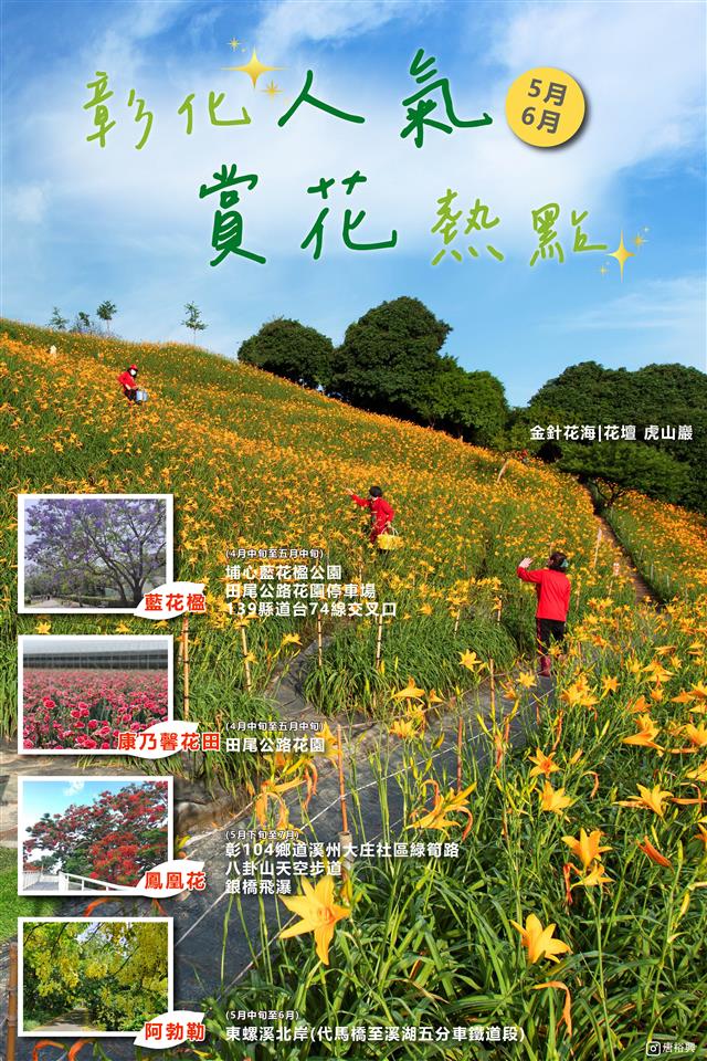 活動快訊 ⋆* ⁑⋆*𝙏𝙧𝙖𝙫𝙚𝙡 𝘾𝙝𝙖𝙣𝙜𝙝𝙪𝙖 ⋆* ⁑⋆* 5-6月人氣賞花熱點 #漫漫彰化花海📷 歷史訊息 | 發布日期 2023/05/08~2023/06/30 | 發佈單位: 城市暨觀光發展處 | 發佈日期: 李科長 (04)7532761 | 更新日期 2023/05/08 | 瀏覽人數: 170人 🌼初夏的陽光與微風吹拂🚲 把花兒的姿態襯托得更迷人了~ 虎山巖的金針花海與田尾的康乃馨花田已經開好開滿啦😍 #母親節 前帶媽咪旅遊彰化賞母親之花吧! #擁抱辛勤的媽咪 拍一張最美的合照💃 ✨收藏彰化賞花情報✨ 任何美的地方都會不錯過! — #金針花海|花壇虎山巖 #藍花楹| 埔心藍花楹公園、田尾公路花園停車場、139縣道與台74線交叉口 #康乃馨花田|田尾公路花園 #鳳凰花|彰104鄉道溪洲大庄社區綠筍路、八卦山天空步道、銀橋飛瀑 #阿勃勒|東螺溪北岸(代馬橋至溪湖五分車鐵道段)