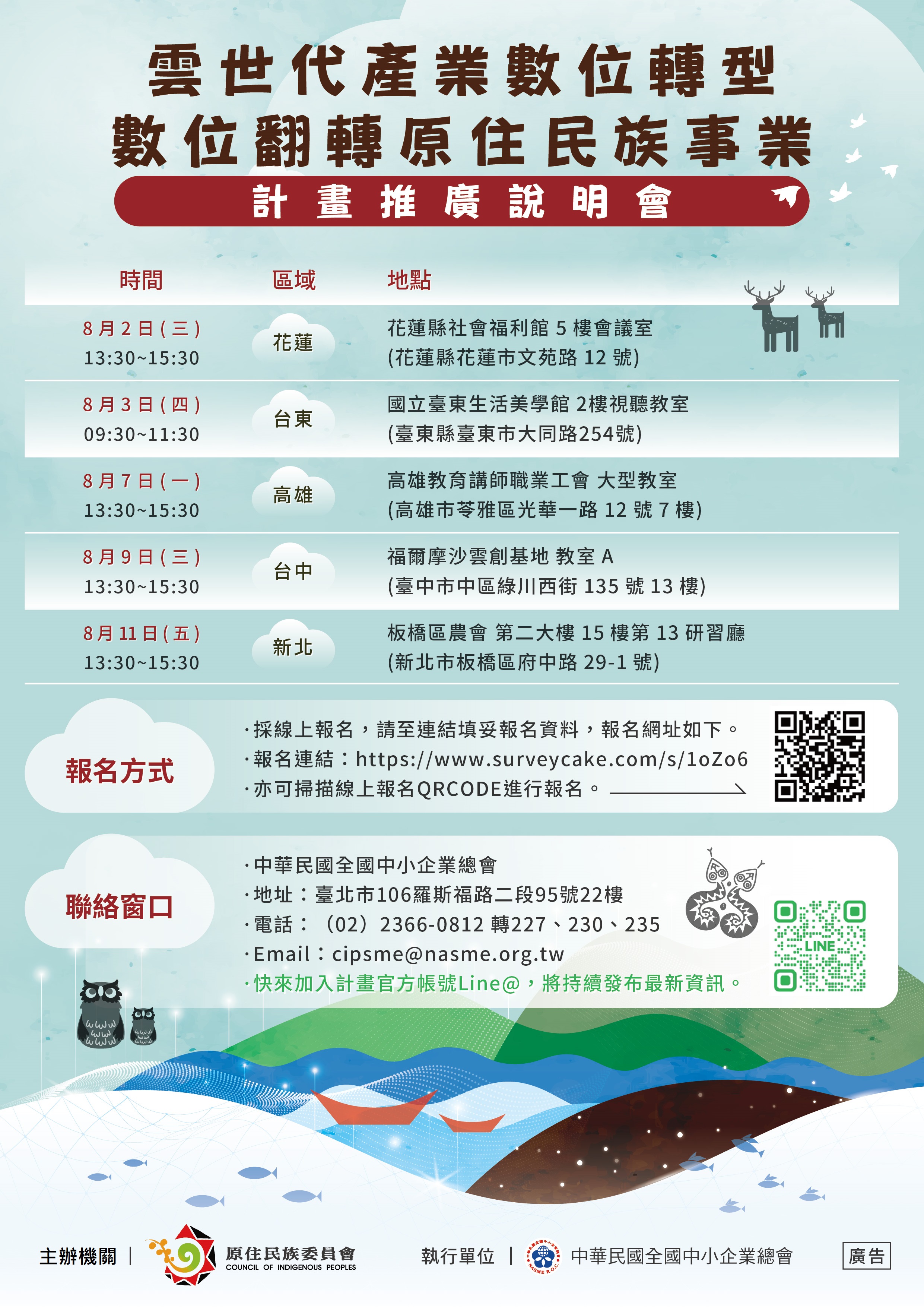 活動快訊 雲世代產業數位轉型-數位翻轉原住民族事業 歷史訊息 | 發布日期 2023/07/31~2023/08/31 | 發佈單位: 民政處原住民暨民族事務科 | 發佈日期: 王韻雯 7223329 | 更新日期 2023/07/31 | 瀏覽人數: 139人 一、為持續協助原住民族企業數位轉型,以進一步提升營運效能,原住民族委員會訂於112年8月2日至8月11日期間,分別假花蓮、臺東、高雄、臺中、新北等地辦理5場說明會。 二、報名方式皆採線上報名(https://www.surveycake.com/s/1oZo6)。 三、旨揭計畫相關資訊及申請須知,請逕上原住民族委員會官方網站最新消息查詢:https://www.cip.gov.tw/。 四、詳情請聯絡資訊聯絡人:原住民族委員會鄭專員02-89953212。