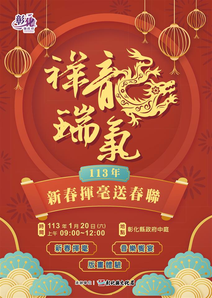 活動快訊 祥龍瑞氣迎新年 新春揮毫熱鬧登場 歷史訊息 | 發布日期 2023/12/12~2024/01/12 | 發佈單位: 文化局視覺表演課 | 發佈日期: 視覺表演科 洪小姐 04-7250057分機1757 | 更新日期 2023/12/12 | 瀏覽人數: 129人 祥龍瑞氣迎新年!彰化縣文化局為迎接113年農曆新春佳節,113年1月20日(星期六)上午9時至12時於彰化縣政府中庭舉辦「祥龍瑞氣-新春揮毫送春聯活動」,將由彰化縣長王惠美與文化局長張雀芬、各書法學會理事長共同揮毫,送上新春賀詞,祝賀鄉親新年快樂。 彰化縣人文薈萃,書法名家眾多,新春揮毫為彰化縣書法家齊聚傳揚書藝的年度盛事,本次活動共開放570份號碼牌供民眾索取,可免費領取大師墨寶一副,號碼牌自上午8:50於活動服務台開始發放,數量有限領完為止。 現場邀請彰化縣書法學會、甲骨文學會、游藝雅集書學會、崇晉書道學會、逸晉書道學會、鹿江詩書畫學會、湘江書畫學會、墨友書畫學會、君承書畫協會、共硯生活藝術學會等共襄盛舉,以及磺溪美展書法篆刻類得獎者、鄭禮勳、洪文黎老師共19位縣內書法家於現場揮毫,民眾得以近距離欣賞大師揮毫風采,現場並邀請彰化國樂團演出、應景年畫版畫體驗,另有打卡按讚送小禮物活動,要給民眾滿滿濃厚年味與創意,增添節慶熱鬧氣氛。