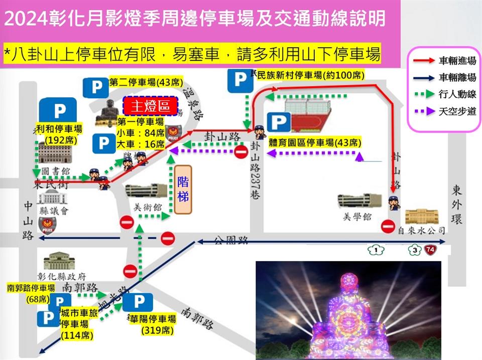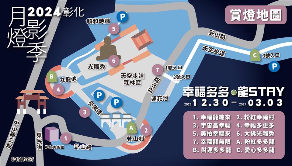 活動快訊 #2024彰化月影燈季 12月30日 晚上6點 💫 正式點亮八卦山 歷史訊息 | 發布日期 2023/12/29~2024/01/29 | 發佈單位: 城市暨觀光發展處 | 發佈日期: 丁科長 7532781分機2781 | 更新日期 2023/12/29 | 瀏覽人數: 159人 #2024彰化月影燈季 12月30日 晚上6點 💫 正式點亮八卦山 ✨幸福多多 · 龍STAY✨ 沉浸式璀璨燈海 氣勢磅礡大佛光雕秀 卡哇伊多多龍主題燈 浪漫粉紅幸福村旋轉木馬 陪你迎接幸福龍年🧨 ➖2024彰化月影燈季-幸福多多龍Stay➖ 🌕活動期間|112年12月30日-113年3月3日 🌕活動地點|八卦山大佛風景區 🌕開燈時間|每日17:30-22:00 🌕光雕秀時間|18:00-22:00 (每半小時一場) 🌕活動官網|https://www.2024ch.com.tw/ ➖🎠 粉紅旋轉木馬 🎠➖ 開放時間|平日 17:30-22:00 假日 10:00-22:00 (除夕不開放) 乘坐方式|憑112年12月至113年2月,於彰化縣內消費300元以上之發票、收據(包含雲端發票)或現場加入彰化縣政府「愛玩彰化」LINE好友( 點擊 https://lin.ee/pu74mFM 或搜尋ID:@playchanghua) 即可免費搭乘一次,已是好友者,請輸入”月”字即可產生兌換券。 _ 📽️大佛光雕秀: https://youtu.be/Gg5NoZLHcdU #2024彰化月影燈季 #多多龍 #幸福多多龍Stay #光雕秀 #旋轉木馬 #彰化旅遊 #八卦山大佛風景區 #龍年