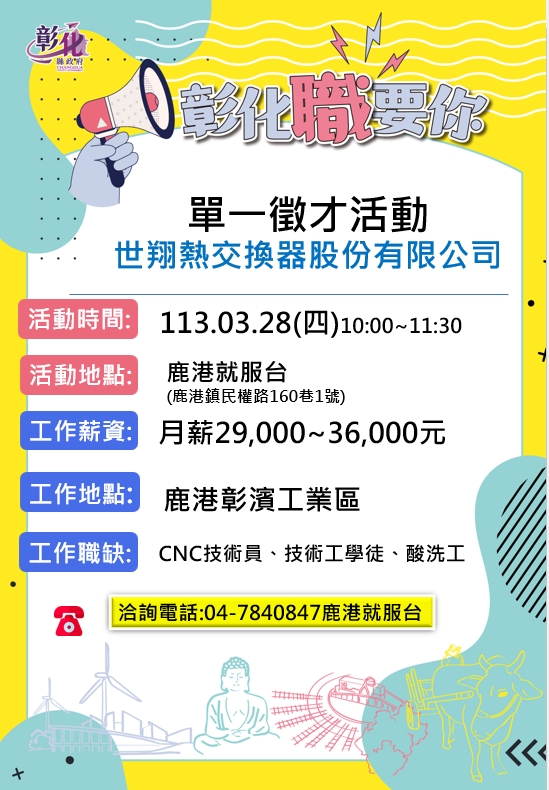 活動快訊 1130328單一徵才活動-世翔熱交換器 歷史訊息 | 發布日期 2024/02/23~2024/03/28 | 發佈單位: 勞工處就業服務科 | 發佈日期: 王靜儀 7840847 | 更新日期 2024/02/23 | 瀏覽人數: 142人 廠商名稱:世翔熱交換器股份有限公司 活動時間:113年3月28日(四)10:00~11:30 活動地點:鹿港就業服務台(鹿港鎮民權路160巷1號) 職務名稱:CNC技術員、技術工學徒、酸洗工 工作地點:鹿港彰濱工業區 工作薪資:月薪29,000-36,000元 ■公司簡介: 國內生產鰭管式熱交換器最大廠,其台灣市場佔有率70%以上,且外銷至東南亞、日本.等國家,目前在設備設計,製造施工,相關產品進出口業務.發電、煉油、石化、化纖設備設計及製造.管線、儀控、設備等之工程.及現場按裝、配管、試車等等。 ■營業項目: 壓力容器、熱交換器、桶槽 等等 ■福利制度: 除法定義務以外之福利: 1. 員工住宿 2. 用餐優惠 3. 制服 4. 在職專業訓練 5. 婚喪喜慶補助 6. 生日、三節禮金、尾牙、聚餐津貼 7. 旅遊 8. 優秀員工表揚獎勵 9. 各類獎金 10. 特約商店等