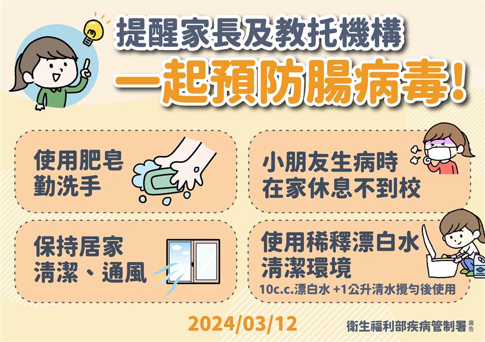 活動快訊 時序即將進入腸病毒好發季節,籲請家長及教托育機構提高警覺,注意環境清潔與消毒,落實生病在家休息並留意重症前兆 歷史訊息 | 發布日期 2024/03/13~2024/04/13 | 發佈單位: 衛生局疾病管制科 | 發佈日期: 魏佩瑜 04-7115141分機102 | 更新日期 2024/03/13 | 瀏覽人數: 175人 疾病管制署 (12)日表示,隨著時序進入春季,腸病毒好發季節即將到來。依據疾管署監測資料顯示,上週(3月3日至3月9日)全國腸病毒門急診就診計6,084人次,與歷年相比已創近十年以來同期最高,且近四週教托育機構因應腸病毒疫情停課累計已超越去(2023)年同期,依據國內歷年監測資料顯示,腸病毒疫情每年約自3月下旬開始上升,預計最快可能於4月進入流行期,於5月底至6月中達到高峰,須持續注意學幼童傳播風險及腸病毒重症前兆病徵。 疾病管制署指出,實驗室監測顯示,近期腸病毒持續於社區中活動,以克沙奇A型為主。今(2024)年國內尚無腸病毒感染併發重症確定病例,但於社區已出現4例腸病毒71型及1例D68型輕症個案。而無論成人、幼兒,都有感染腸病毒的可能,請民眾落實肥皂洗手等個人手部衛生;另,教托育機構及家庭照顧者應定期清潔環境及重點消毒,時常清洗消毒兒童常接觸之物品及玩具,並持續教導學童養成良好的個人衛生習慣,加強學童正確勤洗手、生病在家休息等正確防疫觀念。此外,家長及教托育人員應多加留意學童及嬰幼兒健康狀況,如有出現重症前兆病徵,請儘速送到大醫院接受治療,降低重症風險。 衛生局提醒,酒精對於腸病毒之毒殺效果有限,建議使用含氯漂白水進行消毒,調配時應穿戴防水手套、口罩及圍裙,並注意環境通風;一般環境消毒使用的消毒水濃度為500ppm,即8瓶1,250 c.c.保特瓶清水加入100 c.c.漂白水;用於處理腸病毒患者分泌物或排泄物汙染的消毒水濃度則為1,000 ppm,即8瓶1,250 c.c.保特瓶清水加入200 c.c.漂白水。此外,環境、器具等於消毒水擦拭完畢後,靜待10分鐘再用清水擦拭一次,才算完成消毒步驟。5歲以下嬰幼兒為腸病毒重症高危險群,一旦發現嬰幼兒出現嗜睡、意識不清、活力不佳、手腳無力或麻痺、肌躍型抽搐(無故驚嚇或全身肌肉突然收縮)、持續嘔吐與呼吸急促或心跳加快等重症前兆病徵,請務必立即轉送腸病毒重症責任醫院(彰化縣四家腸病毒重症責任醫院:彰化基督教兒童醫院、秀傳紀念醫院、彰濱秀傳紀念醫院、衛生福利部彰化醫院)接受適當治療,以免錯過治療的黃金時間。