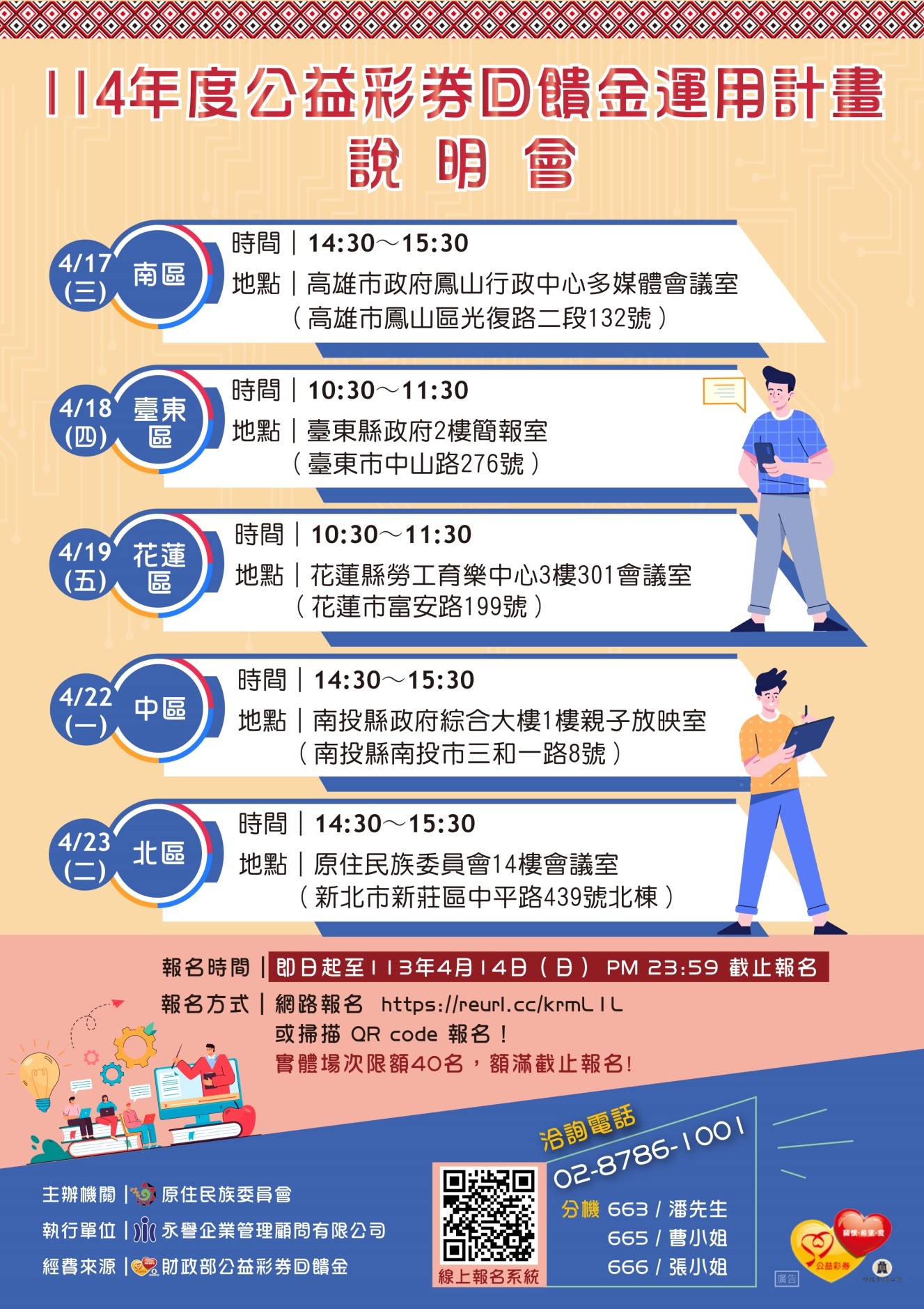 活動快訊 114年度公益彩券回饋金運用計畫說明會 歷史訊息 | 發布日期 2024/04/09~2024/04/23 | 發佈單位: 民政處原住民暨民族事務科 | 發佈日期: 王韻雯 7223329 | 更新日期 2024/04/09 | 瀏覽人數: 170人 一、為鼓勵民間團體提案,並瞭解申請作業程序及規定,原住民族委員會委由永譽企業管理顧問有限公司於4月17日至4月23日期間,辦理5場次計畫說明會(採線上及實體並行辦理),活動訊息已公開於原住民族委員會行政資訊網http://www.cip.gov.tw(為民服務-主動公開資訊-獎補捐助情形-公益彩券回饋金專區): (一) 南區:113年4月17日(三)下午2時30分至5時30分假高雄市政府鳳山行政中心多媒體會議室(高雄市鳳山區光復路二段132號)。 (二) 臺東區:113年4月18日(四)上午10時30分至11時30分假臺東縣政府2樓簡報室(臺東市中山路276號)。 (三) 花蓮區:113年4月19日(五)上午10時30分至11時30分假花蓮縣勞工育樂中心3樓301會議室(花蓮市富安路199號)。 (四) 中區:113年4月22日(一)下午2時30分至3時30分假南投縣政府綜合大樓1樓親子放映室(南投市三和一路8號)。 (五) 北區:113年4月23日(二)下午2時30分至3時30分假本會北棟14樓大型會議室。 二、報名方式及期限:自即日起至113年4月14日止,開放電話、電子郵件及網路線上(https://reurl.cc/krmL1L)報名,實體以每1單位至多報名2位,線上參與不限人次。 三、若有相關問題,請洽永譽企業管理顧問有限公司(02)8786-1001分機663潘先生/信箱:manage66@ever-trust.com.tw。