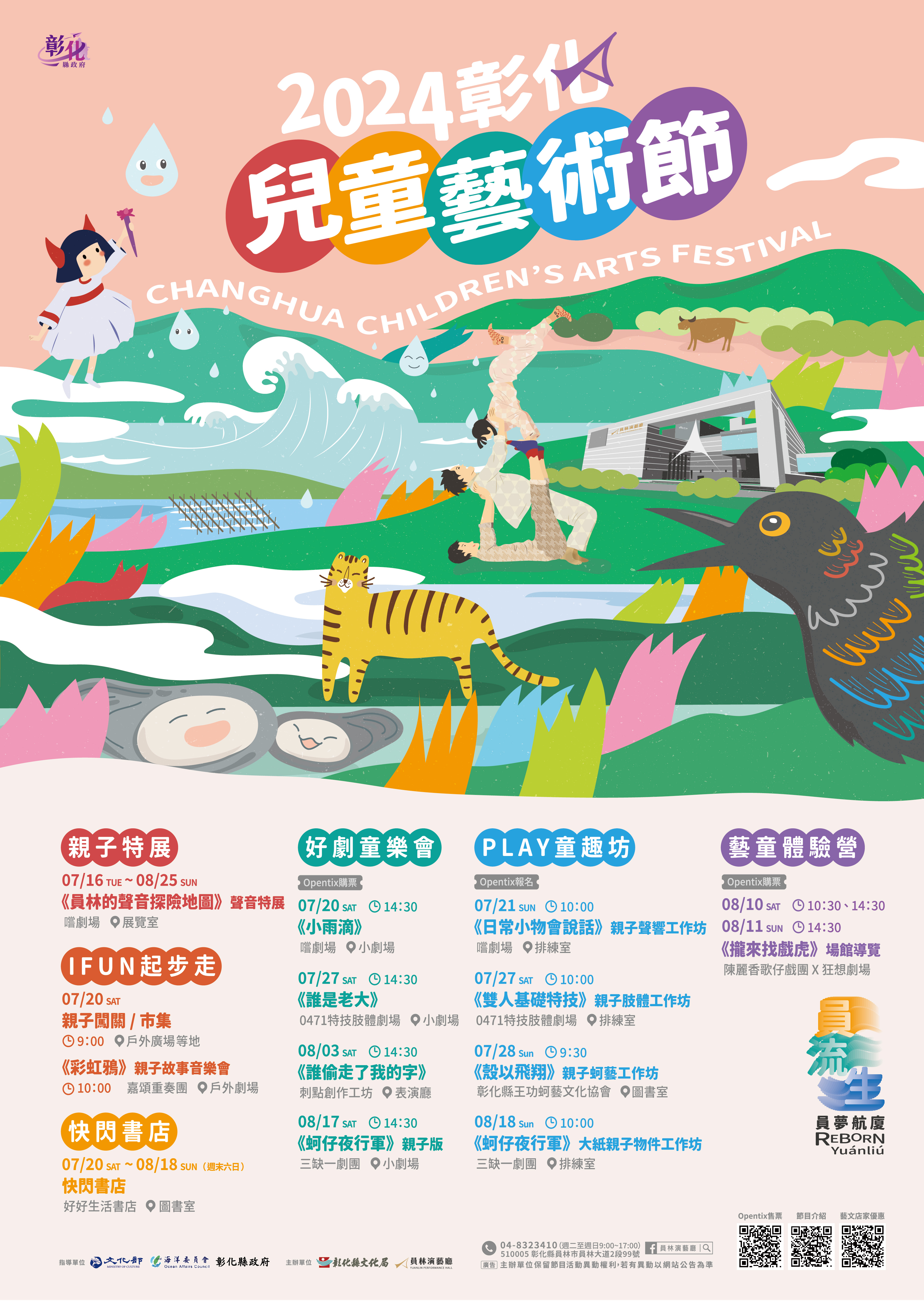活動快訊 2024彰化兒童藝術節 歷史訊息 | 發布日期 2024/05/08~2024/08/25 | 發佈單位: 文化局彰南演藝課 | 發佈日期: 張耕慈 8323410分機305 | 更新日期 2024/05/08 | 瀏覽人數: 186人 彰化縣文化局每年7-8月於員林演藝廳辦理彰化兒童藝術節【親子特展】、【I FUN起步走】、【好劇童樂會】、【PLAY童趣坊】及【藝童體驗營】系列活動。今年夏天,以「員流。生 REBORN Yuánliú」為命題,將帶領孩子們激發出魔幻的旅程,有五感探索、聲音體驗、生命源流相遇、劇場冒險,大手牽小手,一起再一次、認識彼此、一起成長、一起初生、再REBORN新生! 今年彰化兒童藝術節以「員流。生」為主題,首度規劃「聲音、生態、生活」主題系列活動,找尋彰化在地故事的「新生、重生」,也期望透過藝術,一起創造城市「生生不息」的文化新伏流! ❤【早鳥優惠】6月30日(星期日)24時前購買「好劇童樂會」不限張數享75折優惠;購買「《攏來找戲虎》場館導覽」享票價優惠120元。 ❤【當日限定】7月20日「I FUN起步走」開幕式現場購票,滿額400元可抽獎1次,加贈限量、驚喜禮品!有機會抽中「太空投影迷你天文台」、「雙軸炫動光輪平衡扭扭車」、「造型沙灘戲水池」、「抗UV戶外野餐帳篷」、「萬用折疊購物車」等! ❤【藝文店家】113年12月31日前持「2024彰化兒童藝術節」節目票券(含好劇童樂會、藝童體驗營、PLAY童趣坊)至員林演藝廳藝文店家消費,即享有店家優惠唷!(店家擁有最終解釋權)