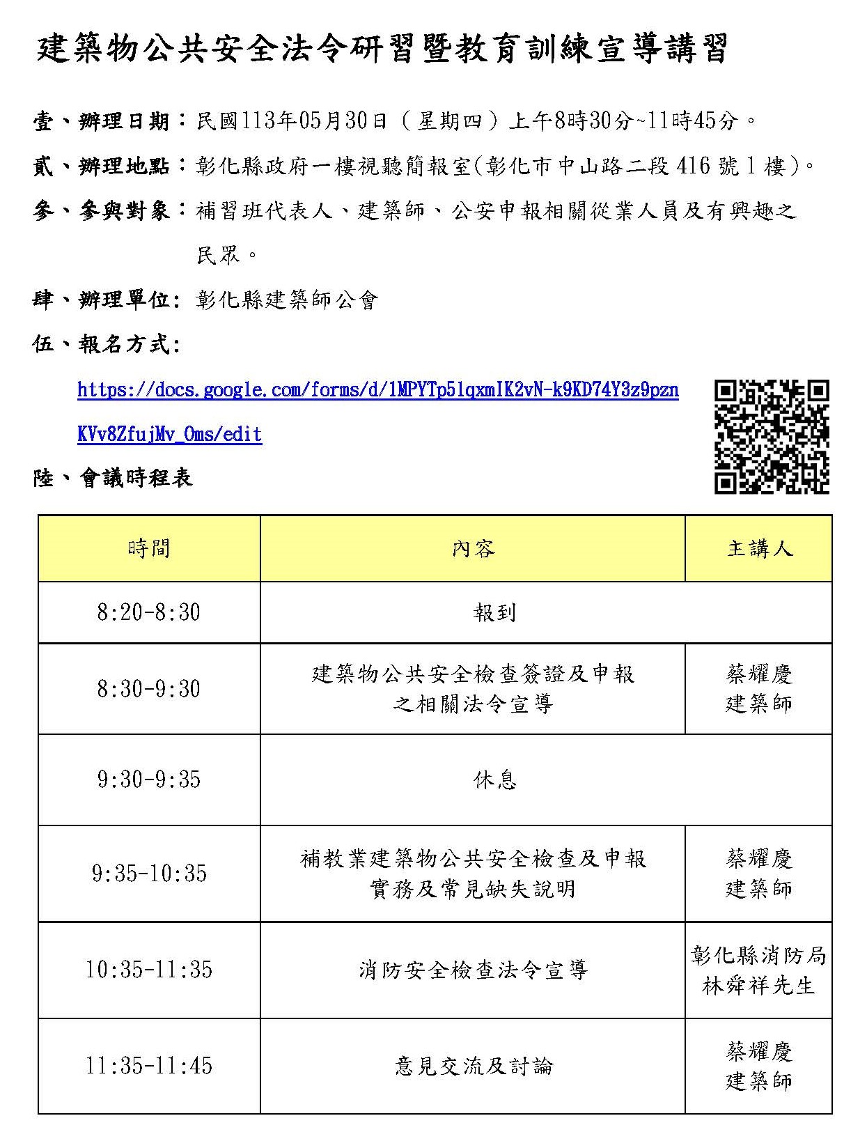 活動快訊 113年5月30日「建築物公共安全法令研習暨教育訓練講習」請踴躍參加 歷史訊息 | 發布日期 2024/05/10~2024/05/30 | 發佈單位: 建設處使用管理科 | 發佈日期: 黃昱程 7531221 | 更新日期 2024/05/10 | 瀏覽人數: 131人 本處訂於113年5月30日(星期四)上午8時30分假本府一樓視聽簡報室辦理「建築物公共安全法令研習暨教育訓練宣導講習」,本次講習主要針對補習班(D5類組)提供相關建築物公共安全申報實務及常見缺失說明,且包含消防局宣導補習班消防安全檢查重點。 (一)講習時間: 113年05月30日(星期四)上午8時30分至上午11時45分 (二)辦理地點:彰化縣政府一樓視聽簡報室(彰化市中山路二段416號1樓) (三)參加對象:補習班代表人、建築師、公安申報相關從業人員及有興趣之民眾。 (四)本專題講座名額有限,額滿為止。 報名連結:https://docs.google.com/forms/d/1MPYTp5lqxmIK2vN-k9KD74Y3z9pznKVv8ZfujMv_Oms/edit