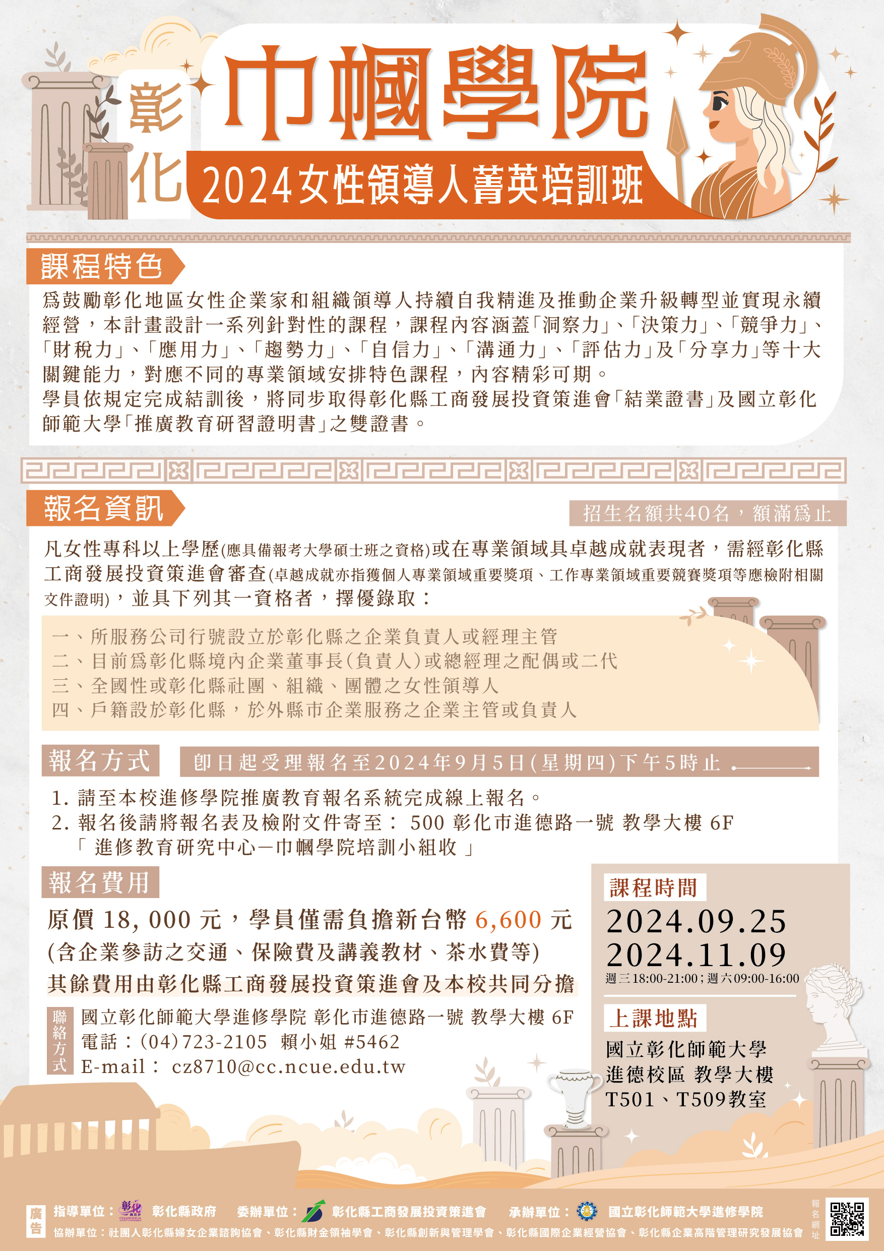 活動快訊 2024巾幗學院-女性領導人菁英培訓班 開始報名囉‼️ 歷史訊息 | 發布日期 2024/07/30~2024/08/30 | 發佈單位: 工商策進會 | 發佈日期: 黃妍欣 720051分機17 | 更新日期 2024/07/30 | 瀏覽人數: 158人 ✨女人有實力,笑容更美麗 💎限量40席,手刀來報名 決策力 𝙓洞察力𝙓 競爭力 𝙓 財稅力 𝙓 自信力...等十大關鍵能力 對應不同的專業領域安排特色課程,內容精彩可期💫 📅上課時間:2024年9月25日(三)至11月9日(六) ,上課時間詳DM簡介 🏢上課地點:國立彰化師範大學進德校區-教學大樓T509教室 💰課程費用:原價18,000元,學員自付6,600元。其餘費用由彰化縣工策會及彰師大補助。 📝報名期限:即日起至9月5日 (四)下午5時止 📞聯絡窗口:彰化師大進修學院 賴小姐 04-7232105#5462 🔗 報名網址: https://reurl.cc/Rqapje